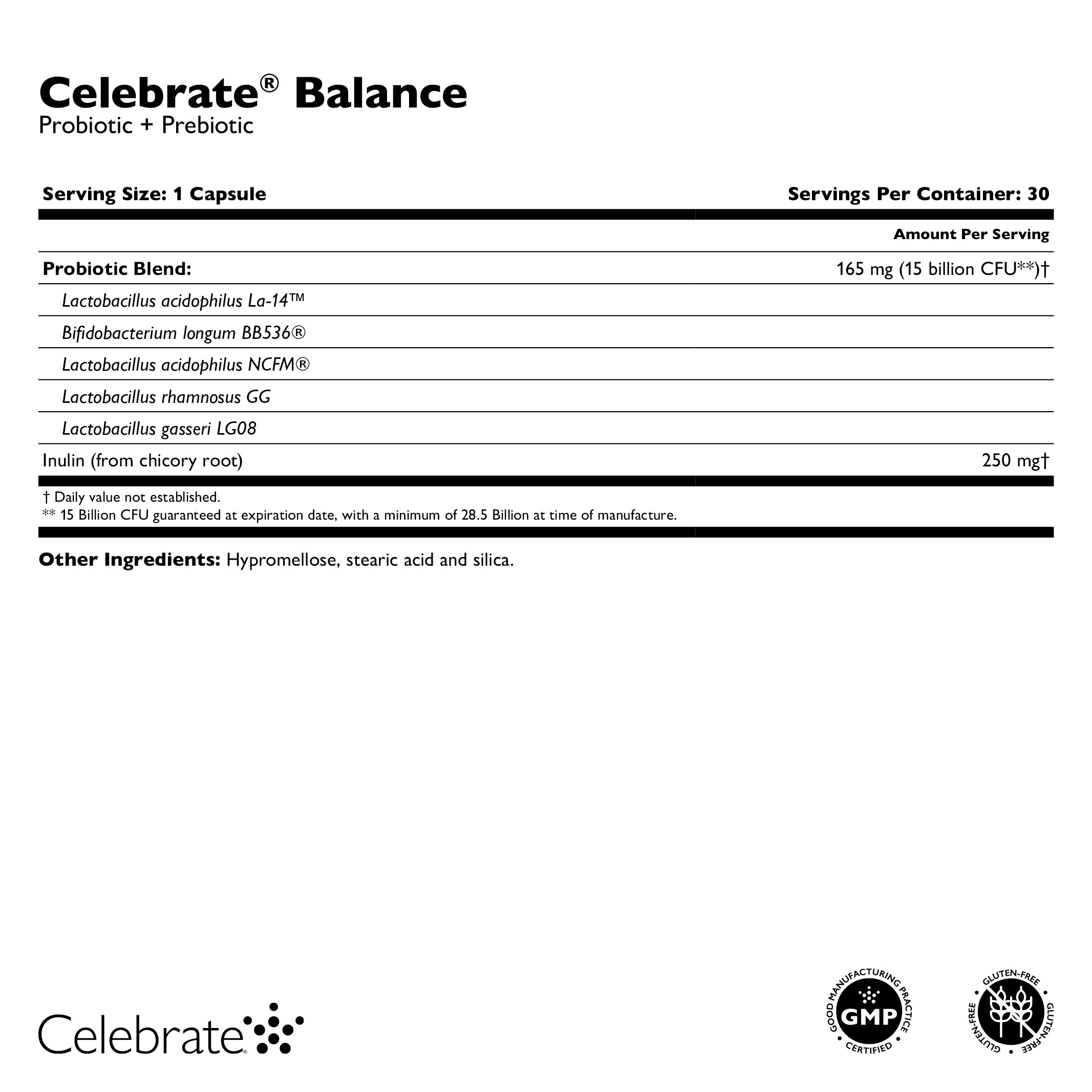 Probiotische Mischung: 165 mg (15 Milliarden KBE**)†, Lactobacillus acidophilus La-14™, Bifidobacterium longum BB536®, Lactobacillus acidophilus NCFM®, Lactobacillus rhamnosus GG, Lactobacillus gasseri LG08, Inulin (aus Chicorée-Wurzel) 250 mg†, †Tageswert nicht festgelegt. Anweisungen: Nehmen Sie täglich eine Kapsel oder nach Anweisung eines Gesundheitsfachmanns als Nahrungsergänzungsmittel ein.
