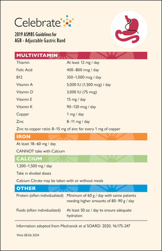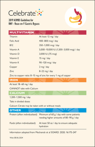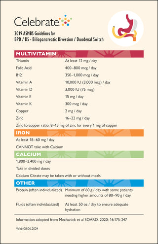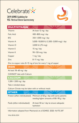 Tüm vitaminler eşit yaratılmamıştır. Aldığınız vitamin ve takviyelerin ihtiyacınız olan besinleri sağladığından emin olun. ASMBS Ek Kılavuzlarının açık ve özlü özetleri, ameliyat türünüze göre yararlı, takip etmesi kolay bir kaynak sunar.